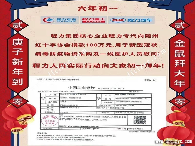 1月25日正月初一,程力專用汽車股份有限公司向隨州市紅十字會捐贈人民幣100萬元,用于抗擊新冠肺炎疫情。此外,該公司正在抓緊調(diào)配設(shè)備,趕制負壓救護車,助力早日打贏這場沒有硝煙的戰(zhàn)爭。
