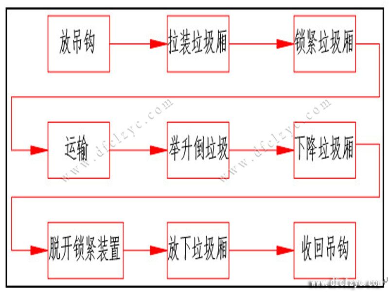 第一步操作控制閥推桿釋放吊鉤,將吊鉤鎖緊在垃圾廂鎖扣上,下一步操作液壓閥回收推桿拉起垃圾廂,緩慢推送到滑軌固定位置,然后運輸?shù)嚼浞胖玫攸c打開垃圾廂后門舉升廂體傾倒垃圾,最后降下垃圾箱運送到回收點放下垃圾廂,收回吊鉤,完成整個工作流程。