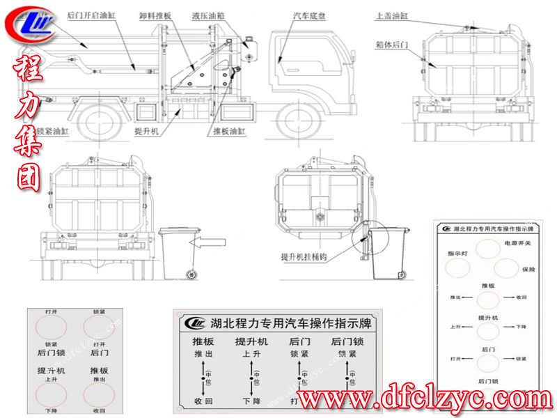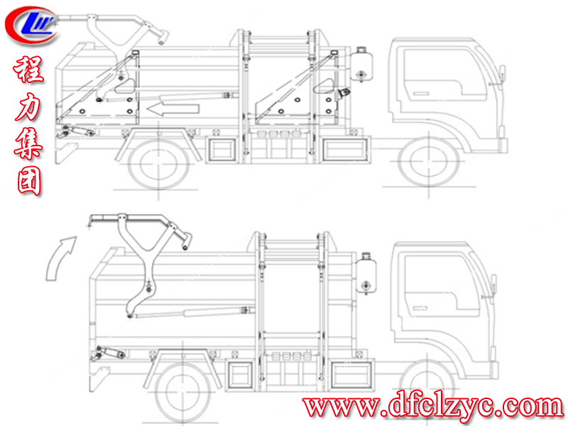 該車操作控制為3個立方分別在駕駛室內(nèi)(電控),箱體前端手動(備用)和箱體前端提升機(jī)旁邊(電控),均可以獨(dú)立控制操作該車的工作,具體操作請遵循以下過程進(jìn)行,在裝載廢物或卸料前,空載運(yùn)轉(zhuǎn)到達(dá)6個標(biāo)準(zhǔn)氣壓時,掛上取力器(駕駛室內(nèi)方向盤左下方),液壓油泵開始工作,檢查各部件有無走漏或反常后,再依照操作牌指示方位和操作方法進(jìn)行操作:同樣地,在該專用車的各項(xiàng)專用功能操作完結(jié)后,摘掉取力器,使液壓體系中止工作。