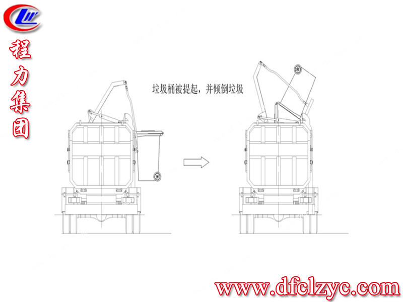 首先將垃圾桶推移到提升機(jī)掛鉤處,同時將桶提掛位放在掛鉤上,推動提升機(jī)操作開關(guān)(或手柄)至上升位置,這時上蓋油缸動作,從而帶動提升機(jī)拉桿向上運(yùn)動,垃圾桶被掛起,同時上蓋也逐漸被打開當(dāng)提升機(jī)和垃圾桶上升到一定位置時,垃圾桶被鎖緊(或壓緊),最后垃圾桶隨提升機(jī)翻板一起上升到箱體頂端,上蓋完全打開,并翻倒