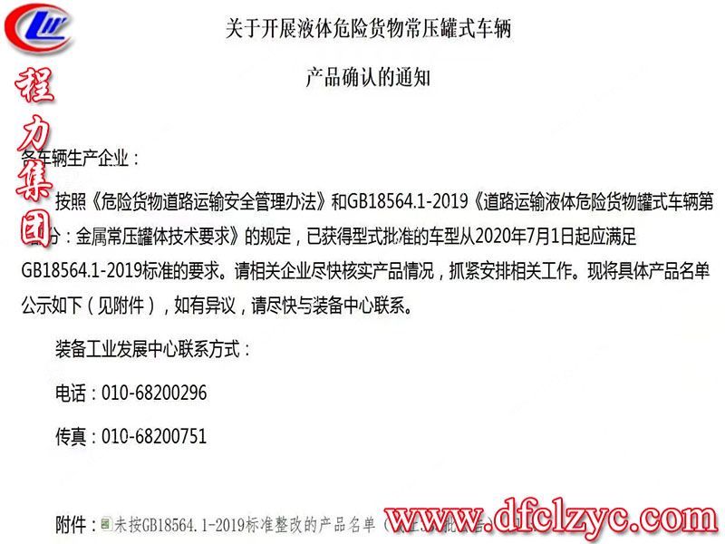 據(jù)經(jīng)濟(jì)日?qǐng)?bào)-中國(guó)商用汽車網(wǎng)訊:6月15日,工業(yè)和信息化部裝備工業(yè)發(fā)展中心發(fā)布《關(guān)于開(kāi)展液體危險(xiǎn)貨物常壓罐式車輛產(chǎn)品確認(rèn)的通知》(以下簡(jiǎn)稱:《通知》)?!锻ㄖ芬蟾鬈囕v生產(chǎn)企業(yè),按照《危險(xiǎn)貨物道路運(yùn)輸安全管理辦法》和GB18564.1-2019《道路運(yùn)輸液體危險(xiǎn)貨物罐式車輛第1部分:金屬常壓罐體技術(shù)要求》的規(guī)定,已獲得型式批準(zhǔn)的車型從2020年7月1日起應(yīng)滿足GB18564.1-2019標(biāo)準(zhǔn)的要求。