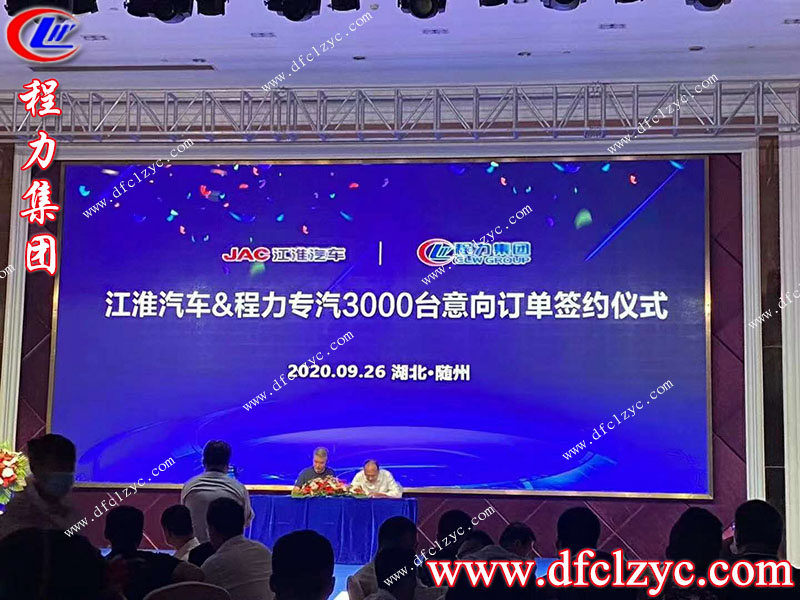2020年9月26日,程力汽車集團(tuán)旗下“程力專汽”再次和“江淮汽車”簽訂3000臺意向訂單,程力集團(tuán)和主機(jī)廠家底盤直供模式再創(chuàng)專用車合作新高。